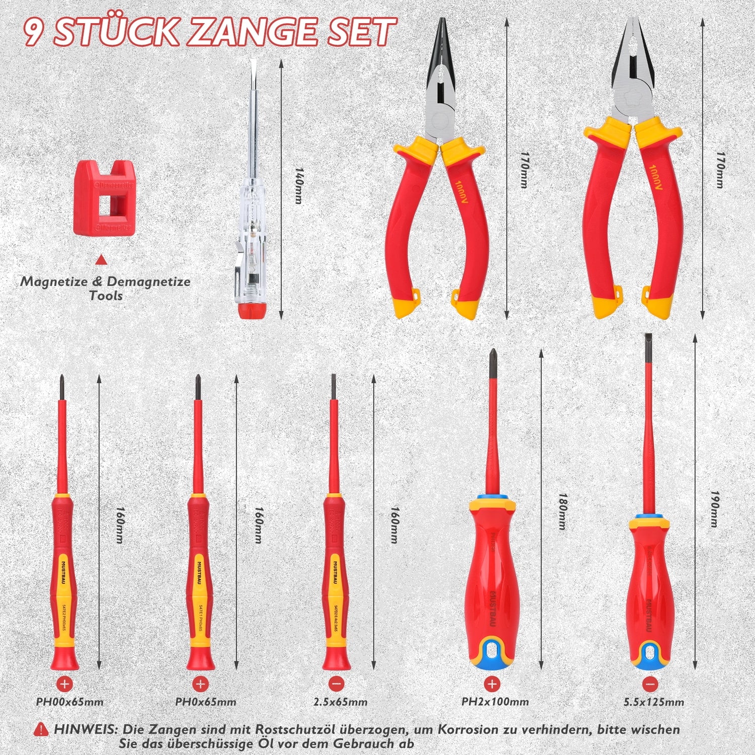 Mustbau 9 Pcs VDE Schraubendreher-Satz Schlitz, Kreuzschlitz, Drahtschneider, Spitzzange, Spannungsprüfer, Ent-Magnetisierer. Ideal für Elektrogeräten, Handys, Computern und Präzisionsgeräten